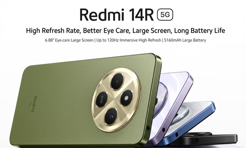 The Redmi 14R features a large screen, long battery life 6.88, eye-protection display, and a 5160mAh battery. It offers up to 8GB of RAM and 256GB of storage.